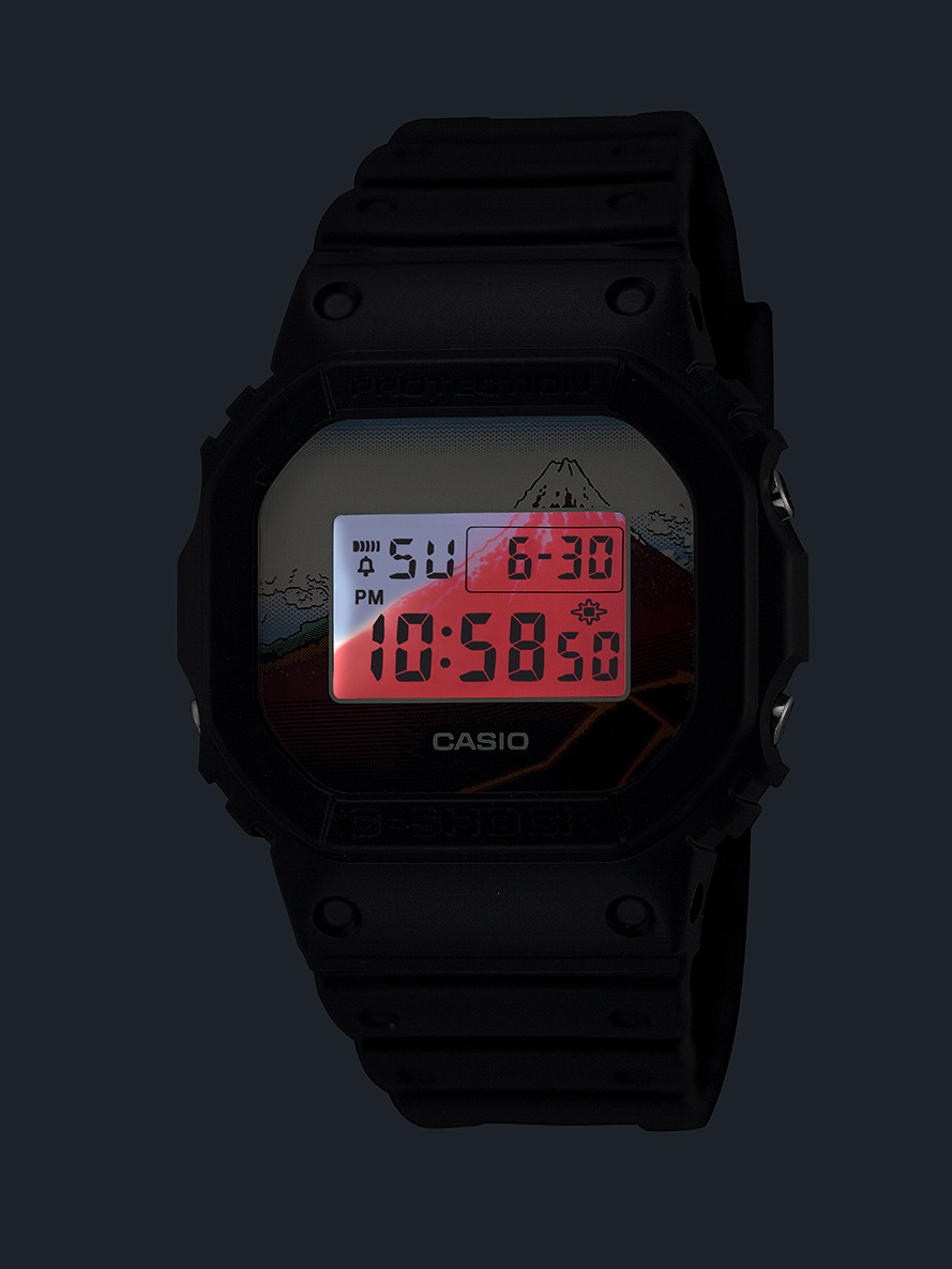世界に誇る浮世絵師、北斎の名作を文字板に凝縮。バックライトに浮かぶ名シーンと、"日本"の誇りを刻んだMade in Japanモデルです。