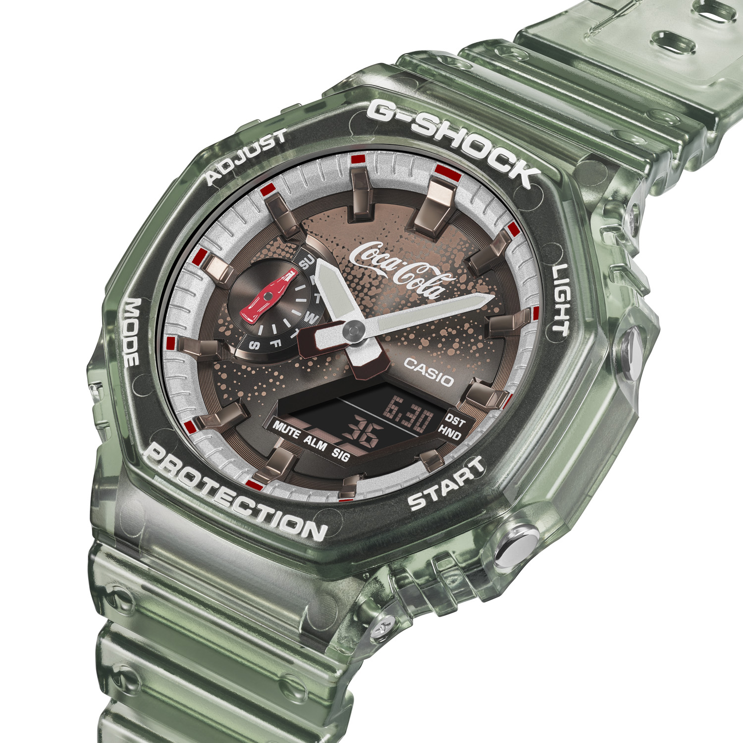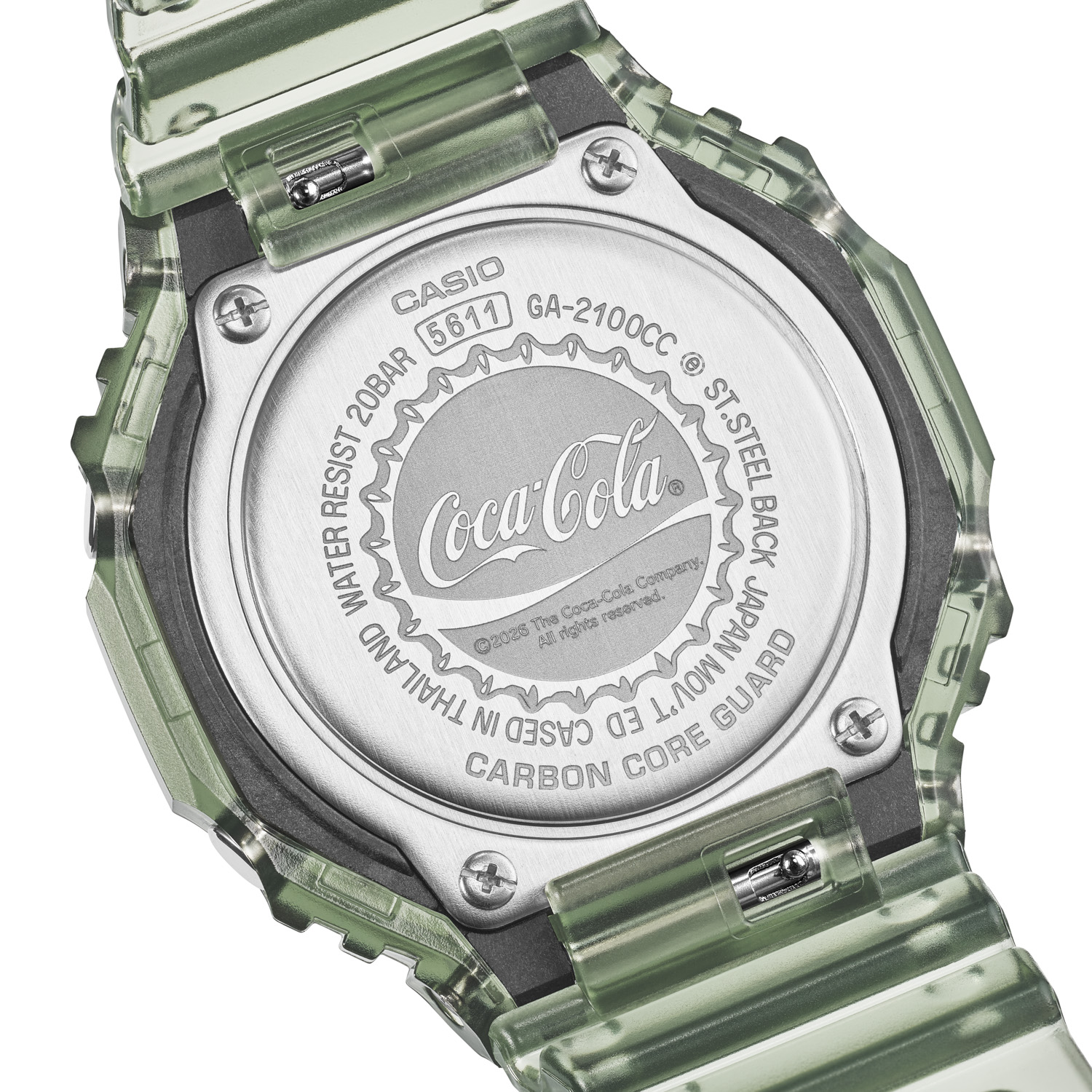 世界中で愛されるコカ・コーラの140周年を祝した、特別なコラボレーションモデル。ベースモデルには人気のGA-2100を採用しました。ベゼルとバンドはコカ・コーラのアイコニックなコンツアーボトル(瓶)を想起させるカラーリングとし、ノスタルジックな雰囲気を演出しています。