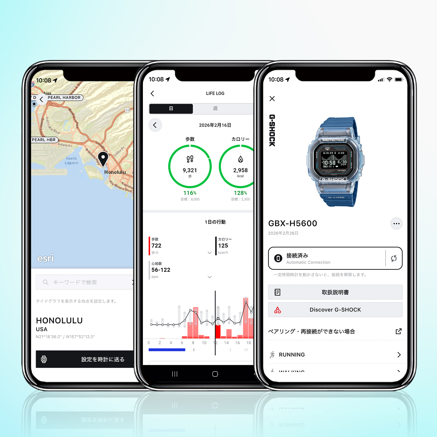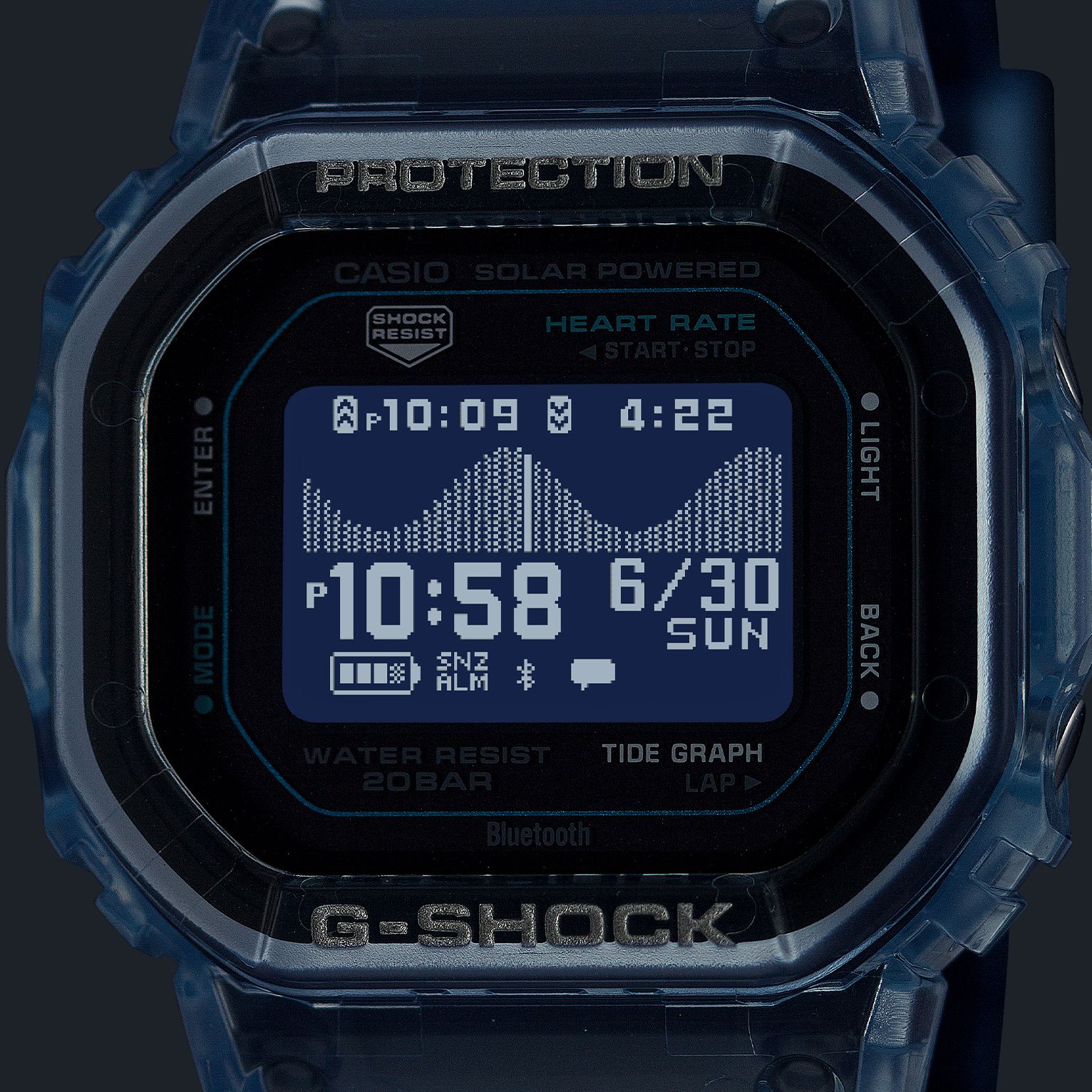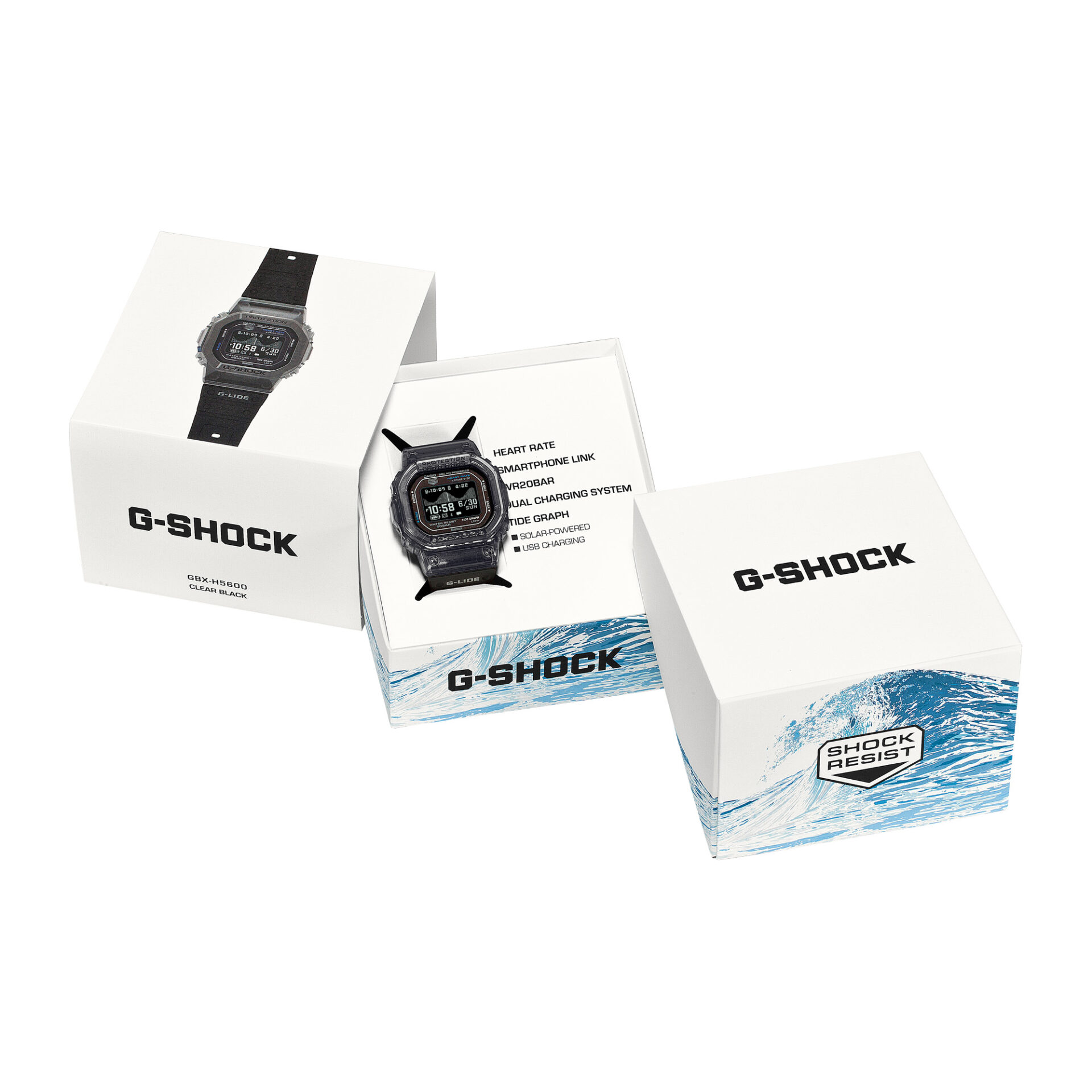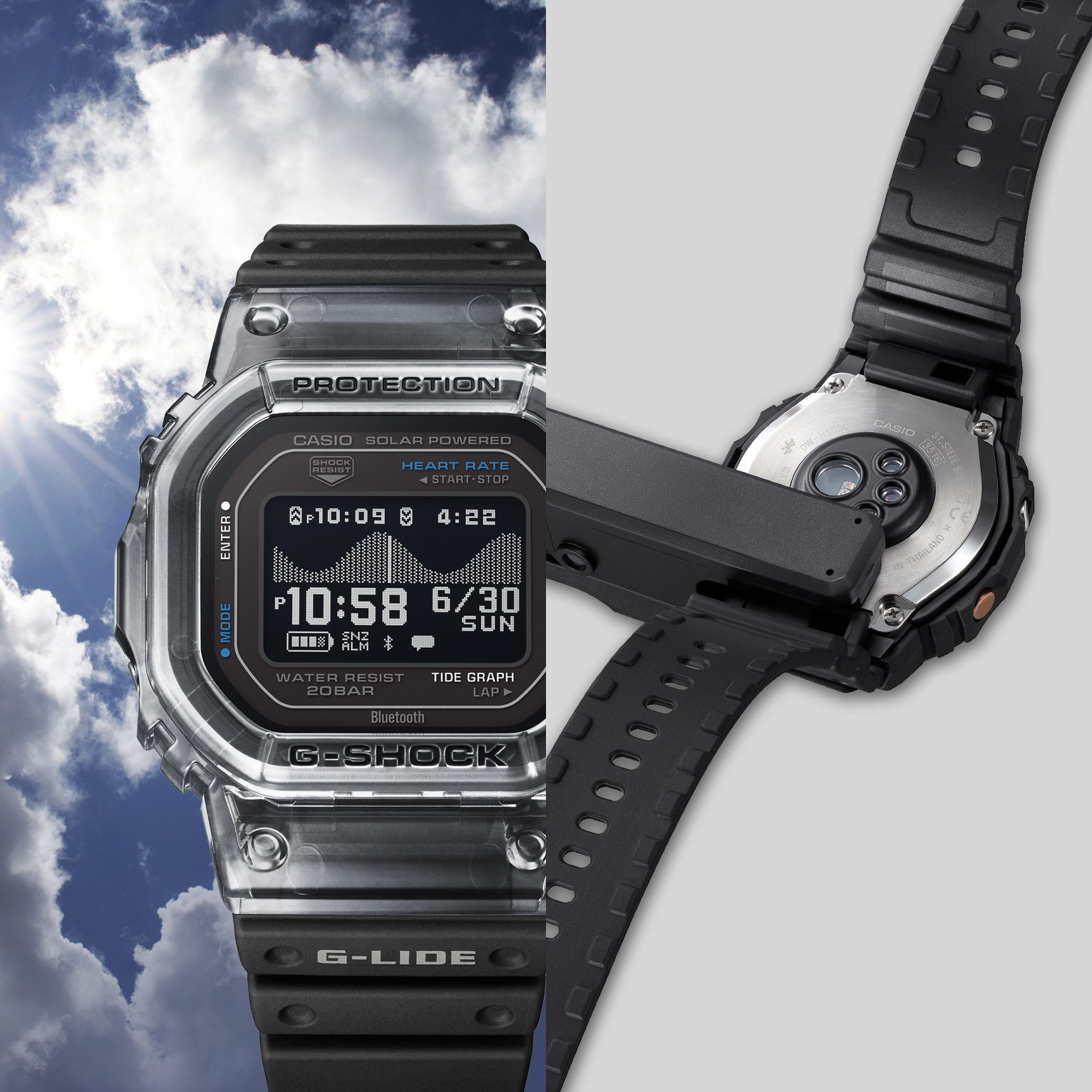 G-SHOCKのスポーツライン「G-LIDE」から待望の新モデル。光学式心拍センサーと加速度センサーを搭載し、サーフィンやランニングなど日々のワークアウトを幅広くサポートします。高精細なMIP液晶を採用し、過酷な環境下でも高い視認性を確保。さらに裏蓋にカーボン強化樹脂を採用することで、従来の心拍計搭載モデル(DW-H5600)から約12gの軽量化を実現しています。